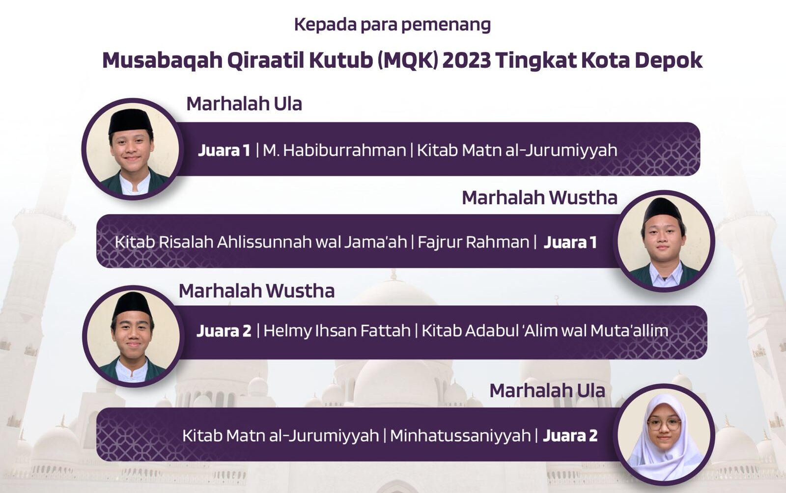 Hari ini, Rabu, 24 Mei 2023, hasil Musabaqah Qiraatil Kutub (MQK) 2023 tingkat Kota Depok keluar. Dari sebelas santri Pondok Pesantren Terpadu Al-Awwabin Depok yang mengikuti, alhamdulillah, empat santri berhasil meraih juara. Dua di antaranya lolos ke tingkat Provinsi Jawa Barat.